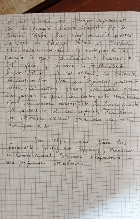 Voyant que sa situation avec l’enfant se dégradait de plus en plus, la femme a approché les casques bleus de la MINUSCA pour leur raconter ce qui lui était arrivé, mais aucune suite favorable ne lui a été accordée concernant la prise en charge de l’enfant.