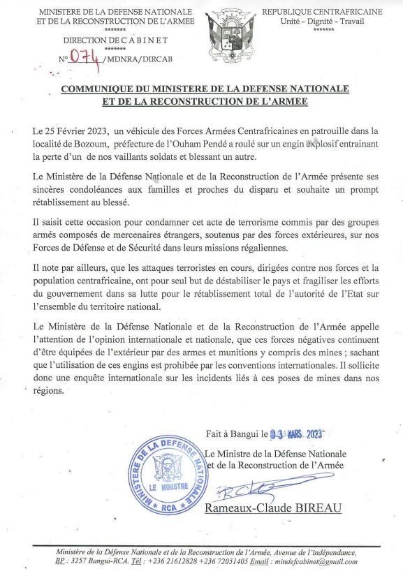 « Le ministre de la défense nationale et de la reconstruction de l’armée appelle à l’intention de l’opinion internationale et internationale les forces négatives continuent d’être équipés de l’extérieur par les armes et minutions y compris des mines ; sachant que l’utilisation de ces engins est prohibée par les conventions internationales. Il sollicite donc une enquête internationale sur les incidents liés à ces poses de mines dans nos régions », indique un communiqué de la défense signé ce vendredi 3 mars 2023 par le ministre Rameaux Claude Bireau.